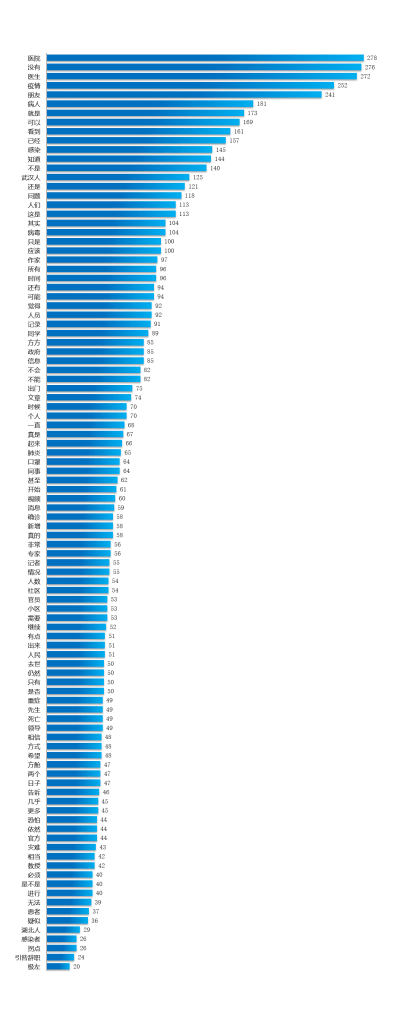 所以仅从词频看,方方无非就是在谈疫情对人们的影响。我通读完方方60篇日记,的确也是这样的感觉,就是那种隔壁老太太唠家常,时不时发点牢骚。那个著名的“极左”恰好排在第100位。当然很多人期望看到的“火神山”出现了5次,没有上榜,“雷神山”出现了3次,也没有上榜。“援助”13次,“支援”9次,“胜利”8次,都无缘前100名。