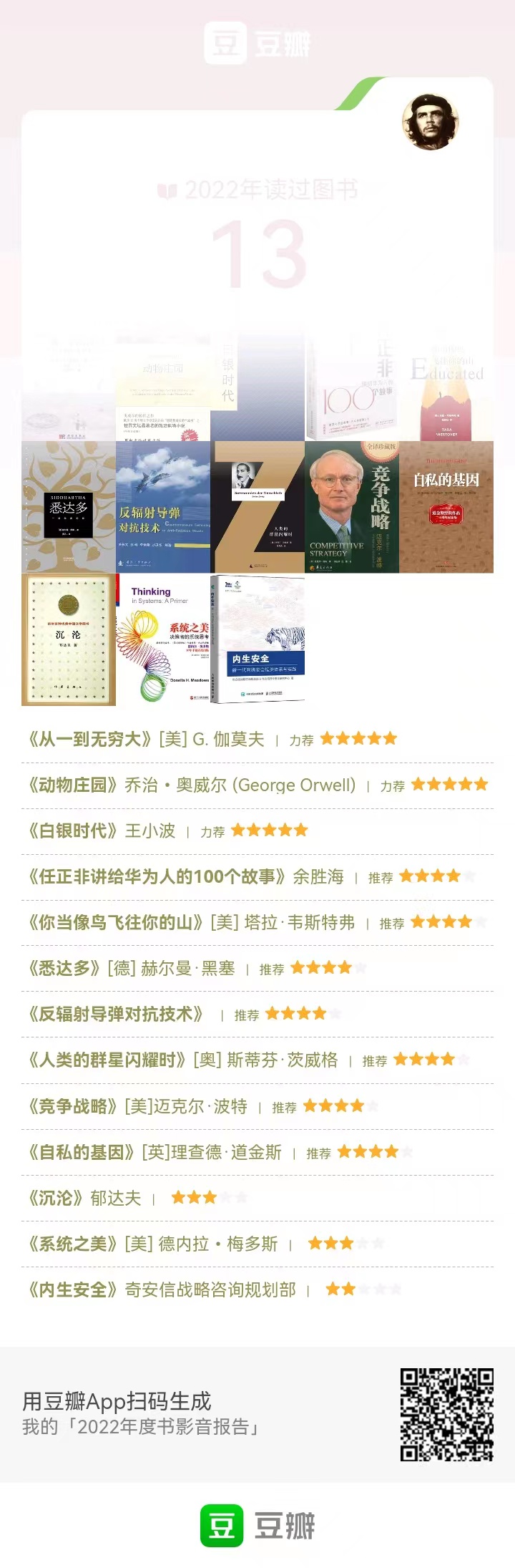 2022注定是不平凡的一年,多年以后回看,也许会发现这是改变自己、改变家人、改变中国、改变世界的一年,太多事情发生,太多意外出现,有欢乐,有焦虑,有失落,有希望,更有满满的收获。2023,工作会更加紧张,但精神生活仍将继续,目标略微修改为: