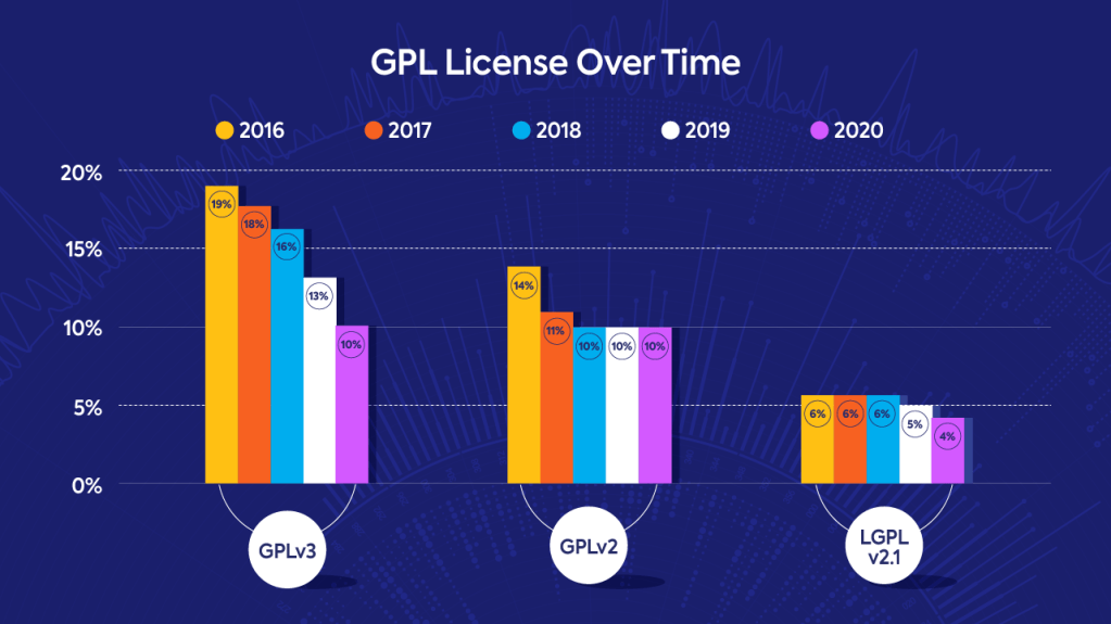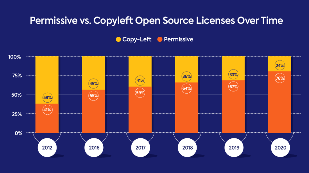 下面这张图直接对比严格的Copy-Left和宽松的license(比如Apache2.0,MIT和BSD等),很明显,人们还是喜欢宽松的。