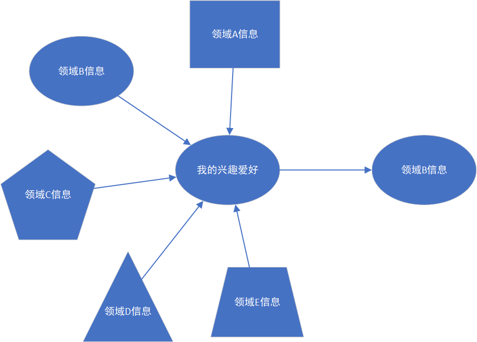 信息茧房的产生可以用下面几张图表示。刚开始我们可以接收到各种类型信息,从领域A到领域E不等,可是我们的兴趣爱好是领域B,我们就会更多阅读吸取领域B的信息,对其它领域信息快速跳过或置之不理,犹如我们的兴趣爱好是一个滤波器,将只满足我们这滤波器频带的信号滤过而阻止其它频带的信号通过。